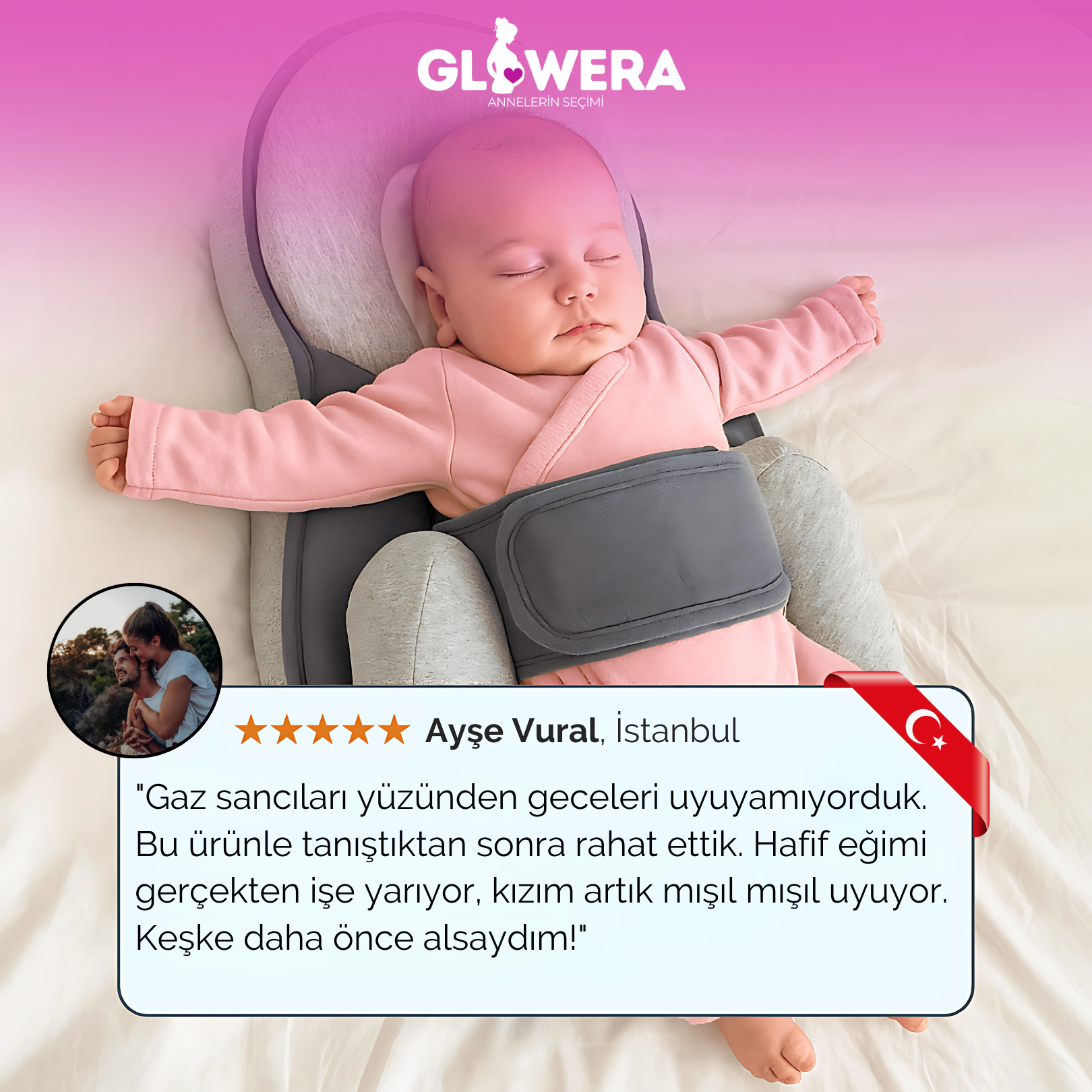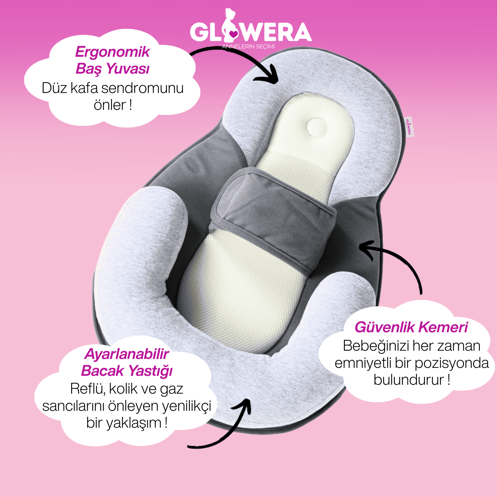 Glowera Bebek Yatağım, bebeğinizin ihtiyaç duyduğu yumuşak yükseltmeyi sağlarken güvenli sırt üstü yatış ve uyku pozisyonunu da korur.